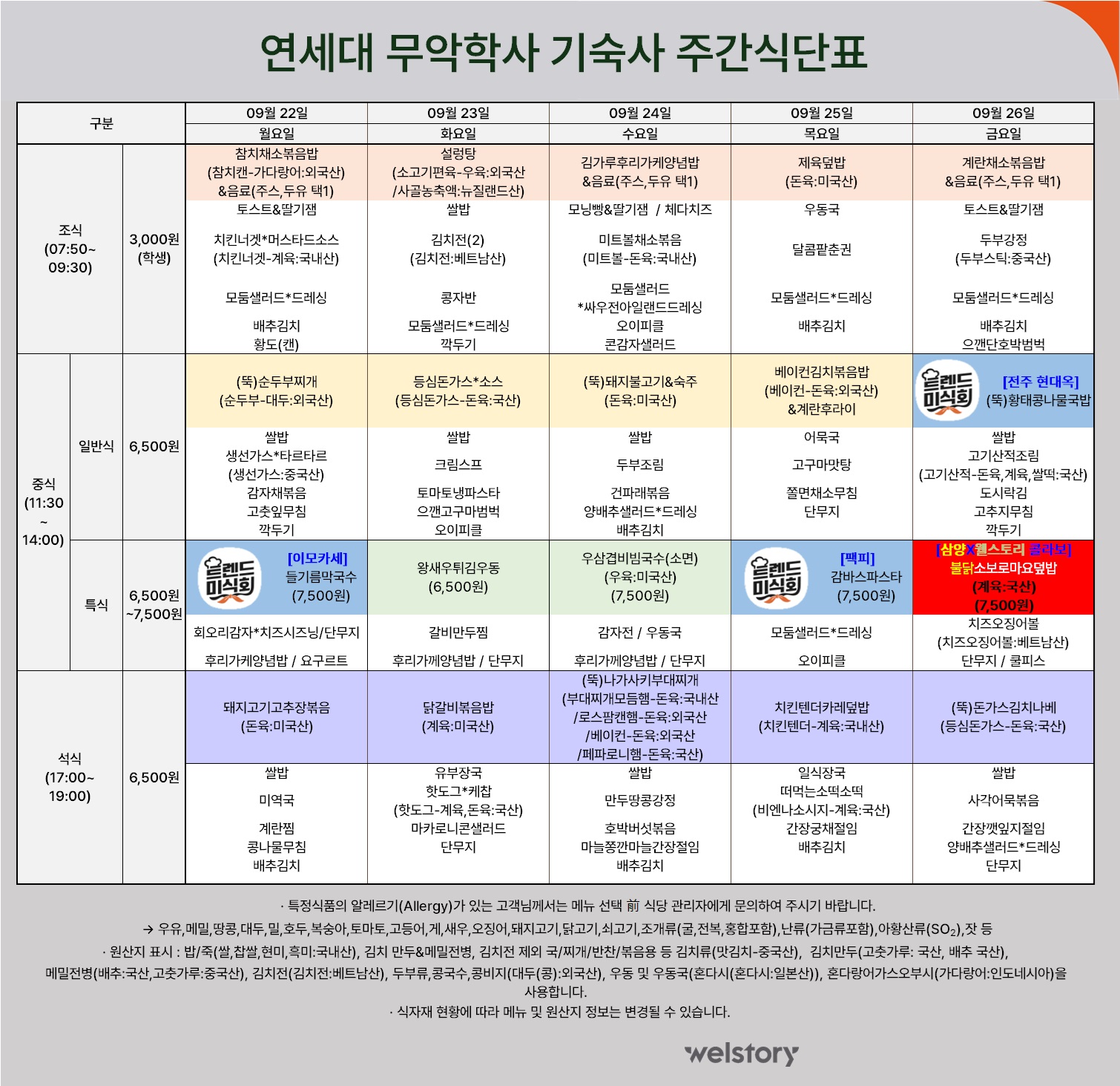 무악2학사 식당 주간식단표(9.22 ~ 9.26)