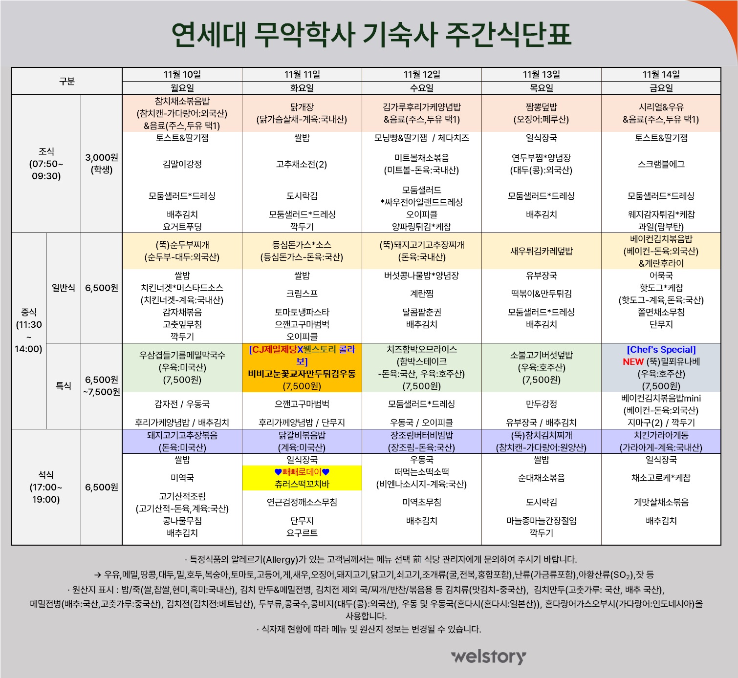 무악2학사 식당 주간식단표(11.10~11.14)