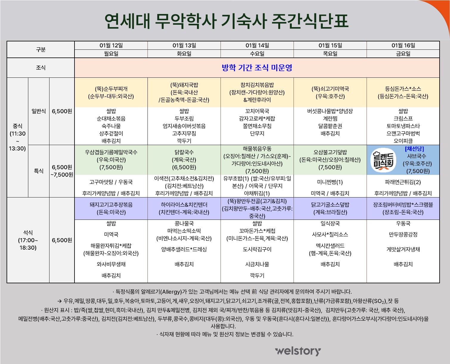 무악2학사 식당 주간식단표(1. 12.~1. 16.)