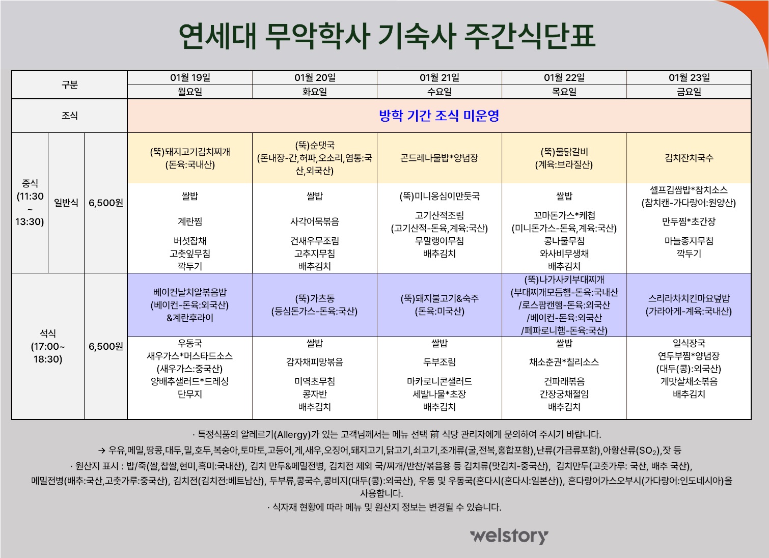 무악2학사 식당 주간식단표(1. 19.~1. 23.)