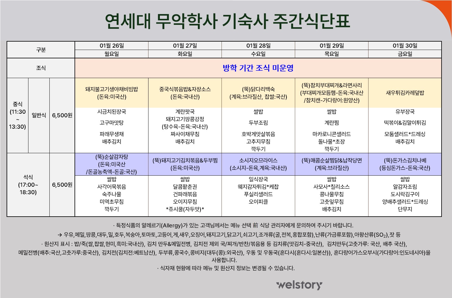 무악2학사 식당 주간식단표(1. 26.~1. 30.)