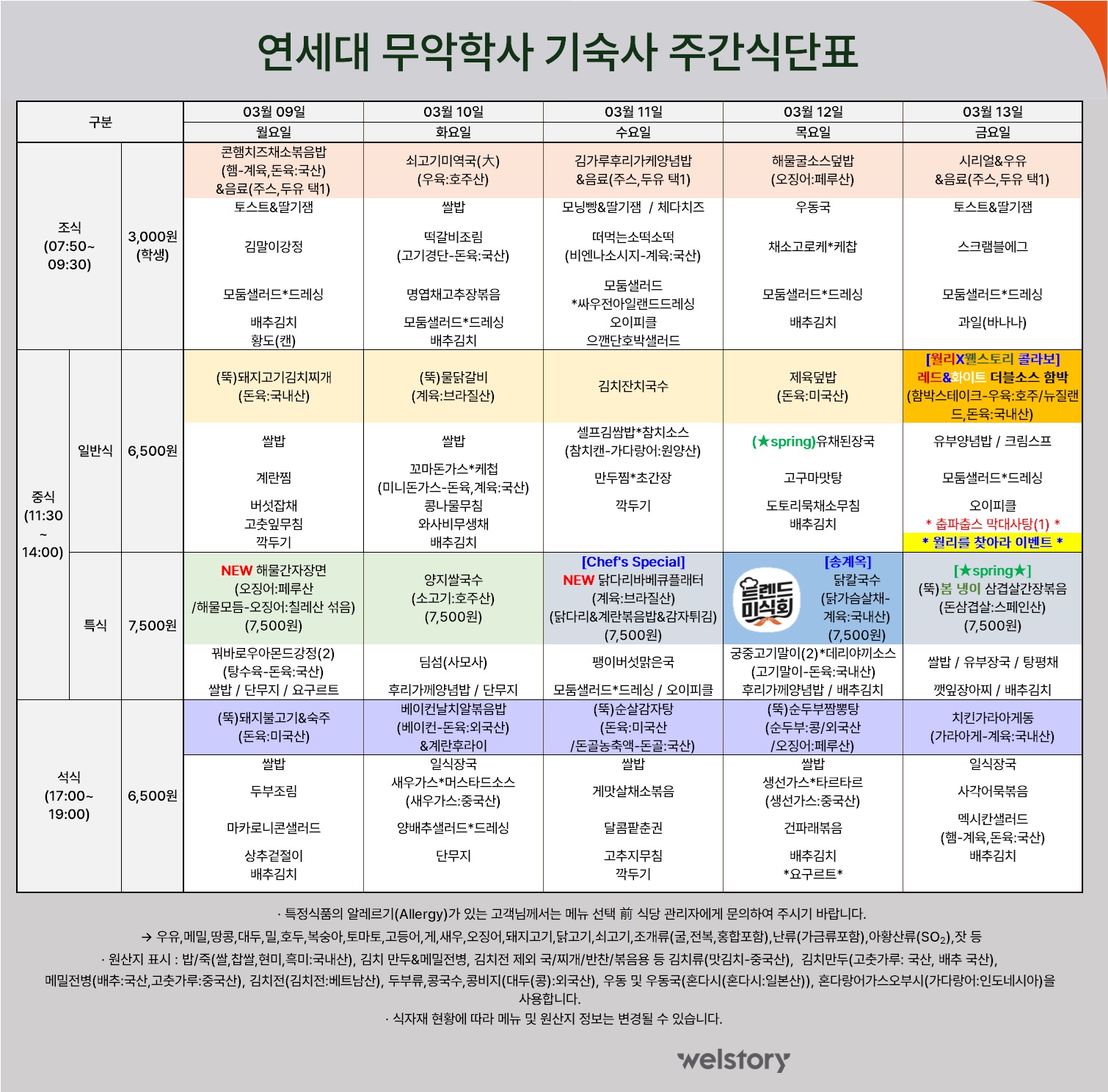 무악학사 식당 주간식단 (2026.3.9 ~ 3.13)