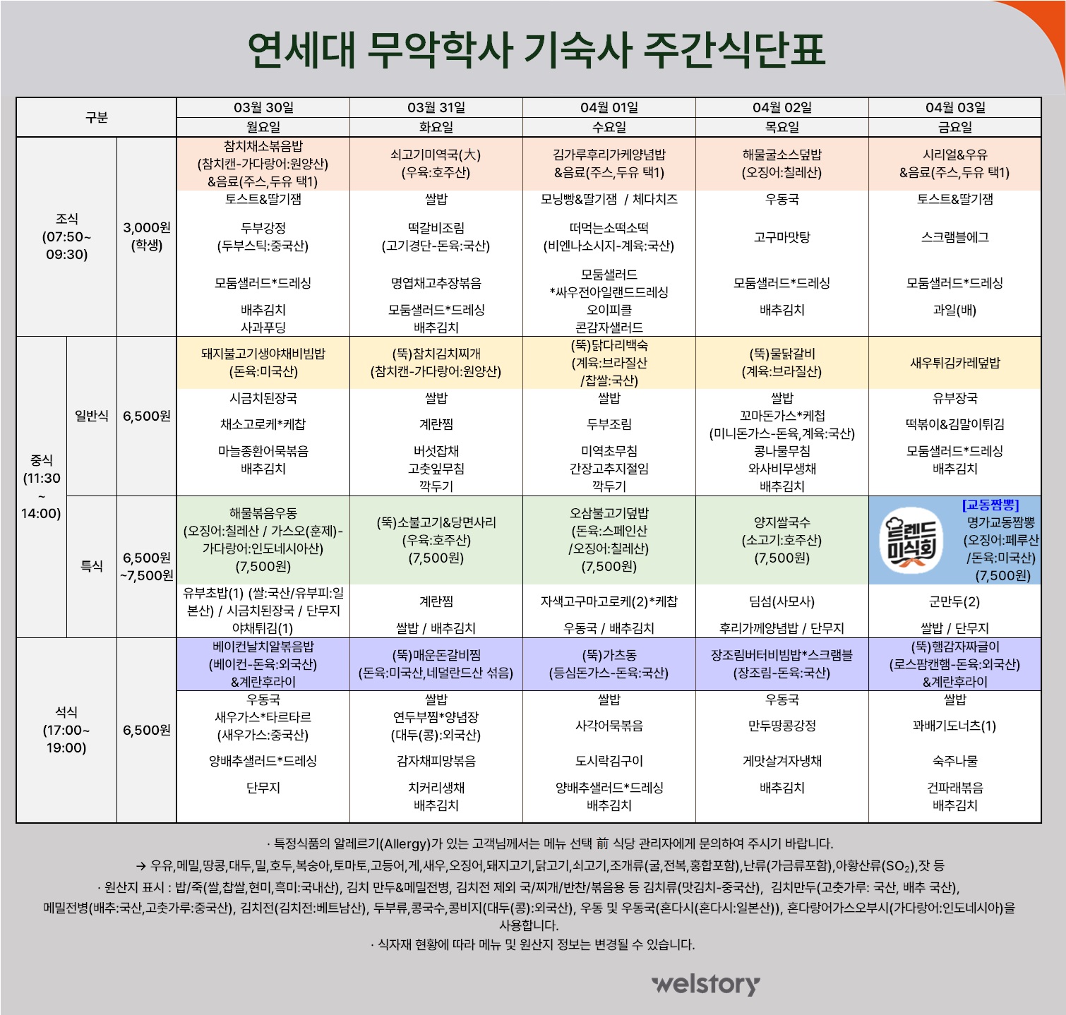무악학사 식당 주간식단 (2026.3.30 ~ 4.3)