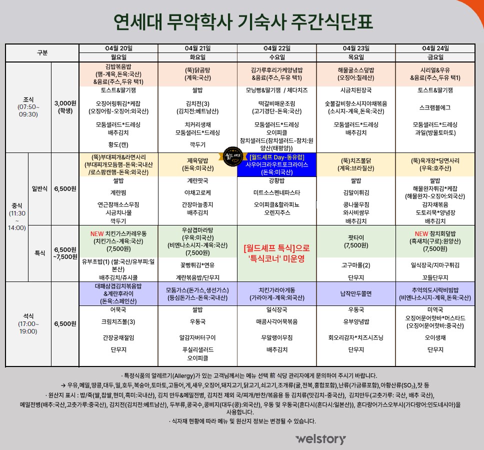 무악학사 식당 주간식단 (2026.4.20 ~ 4.24)