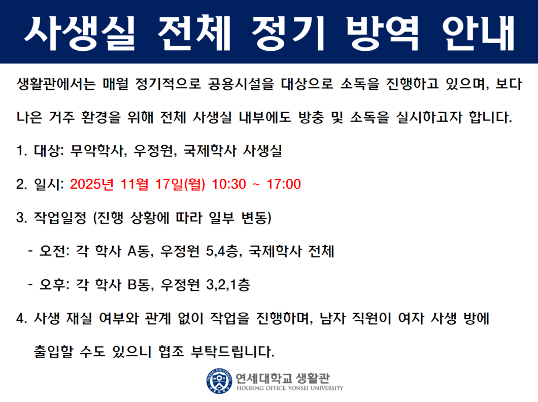 사생실 전체 정기 방역 안내
