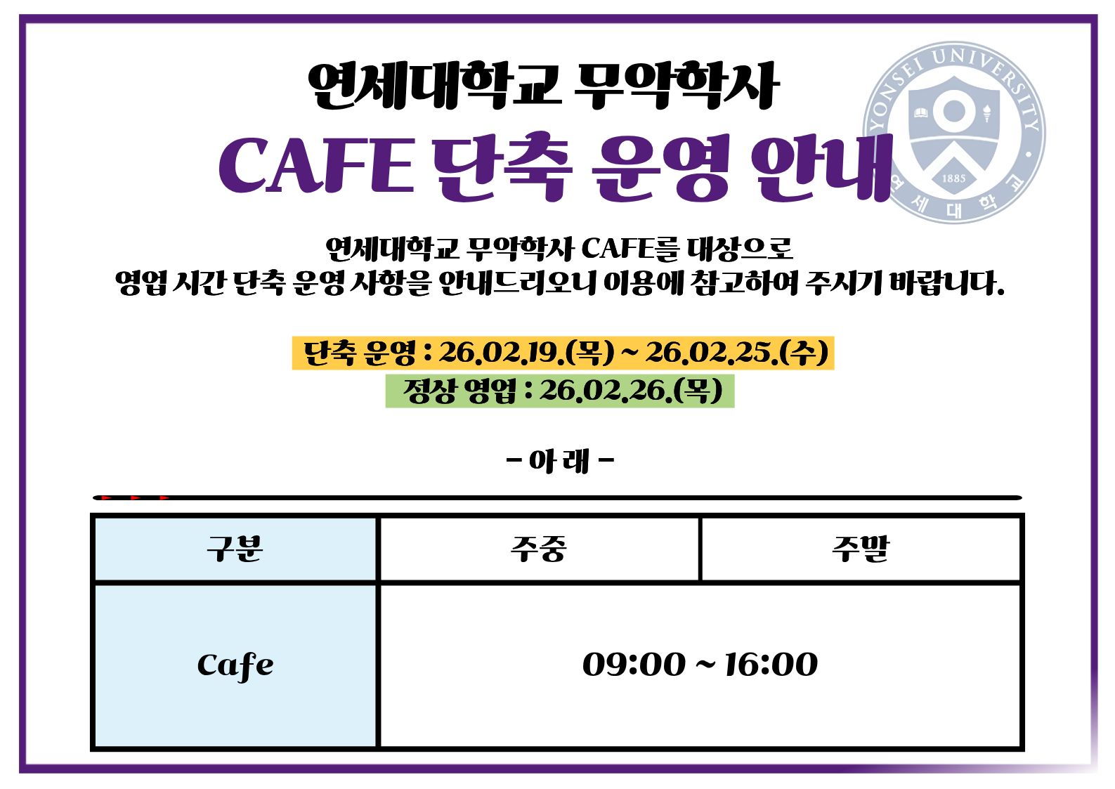 연세대학교 무악학사 CAFE 단축 운영 안내